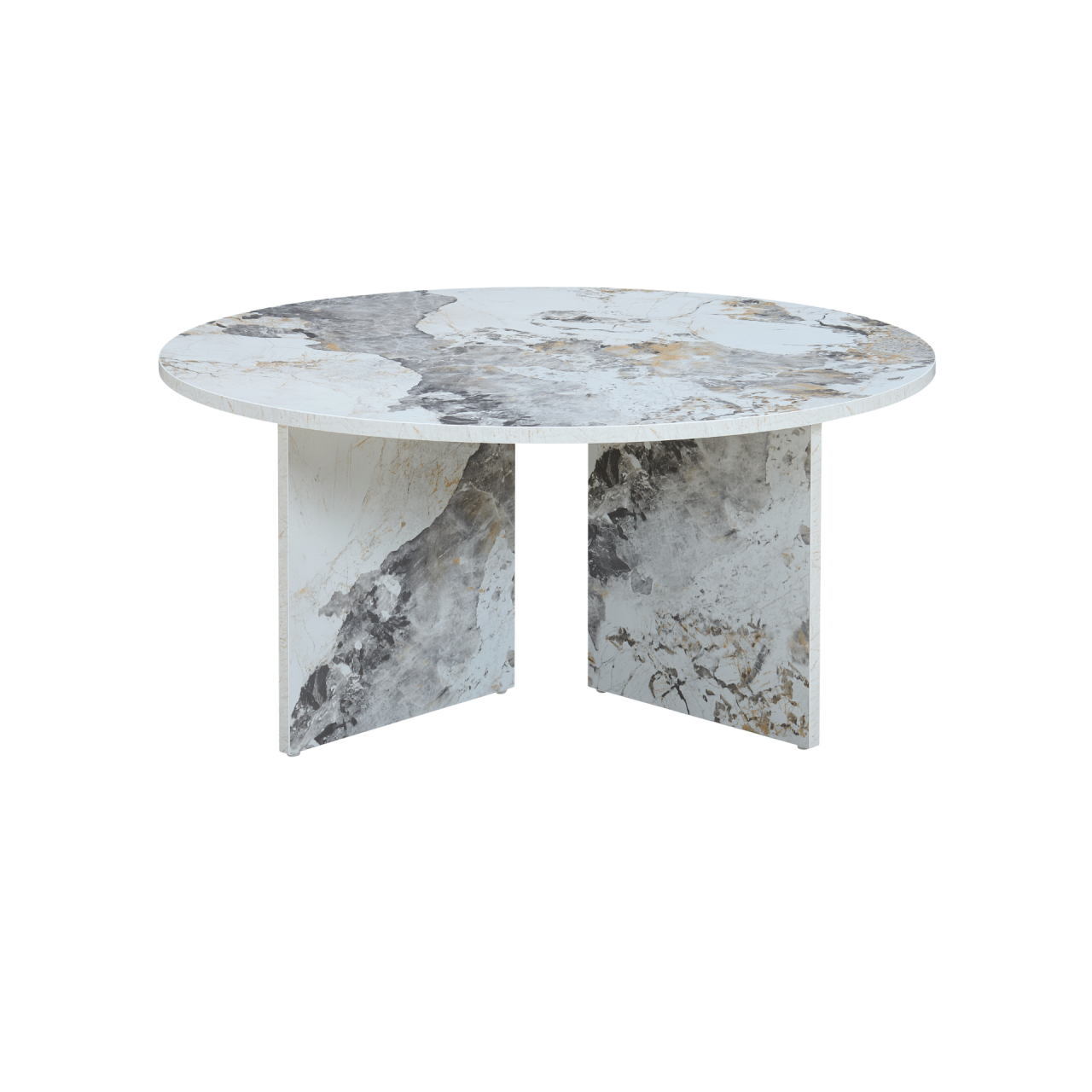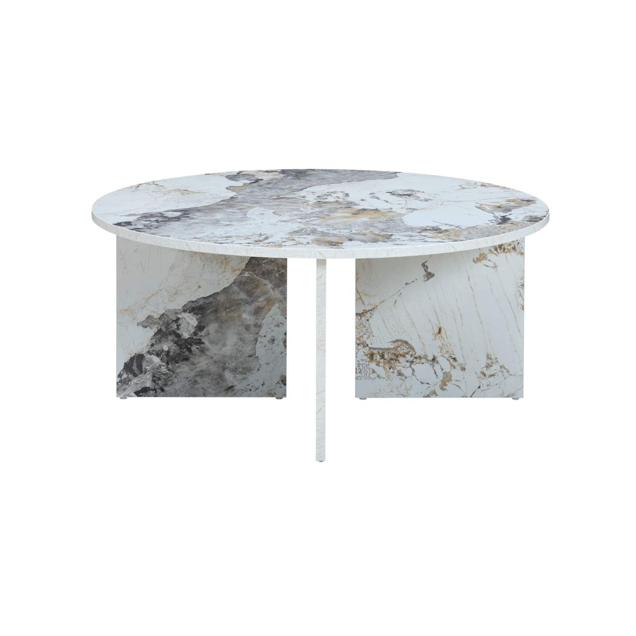 The Aura Circle Coffee Table features a sleek, marble effect finish and a spacious round top. It has 4 rectangular legs, perpendicular to each other, which give it a symmetrical look to match its circular design. This trendy piece is ideal for modern residential spaces, as well as reception and communal areas. Made with durable materials, it provides a sustainable solution for contemporary interiors.