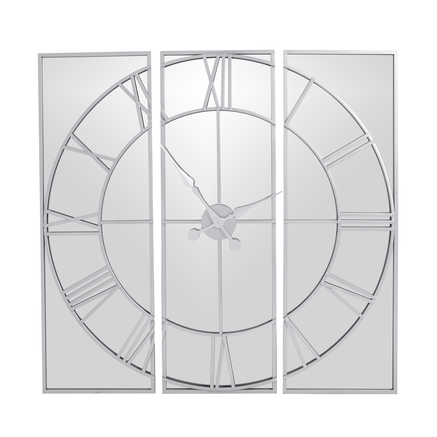 This is the Celina Mirrored Wall Clock. A stunning 3 panel wall clock with contemporary metal work skeleton style clock face over clear glass mirror. This item’s mechanism is on the reverse side of th