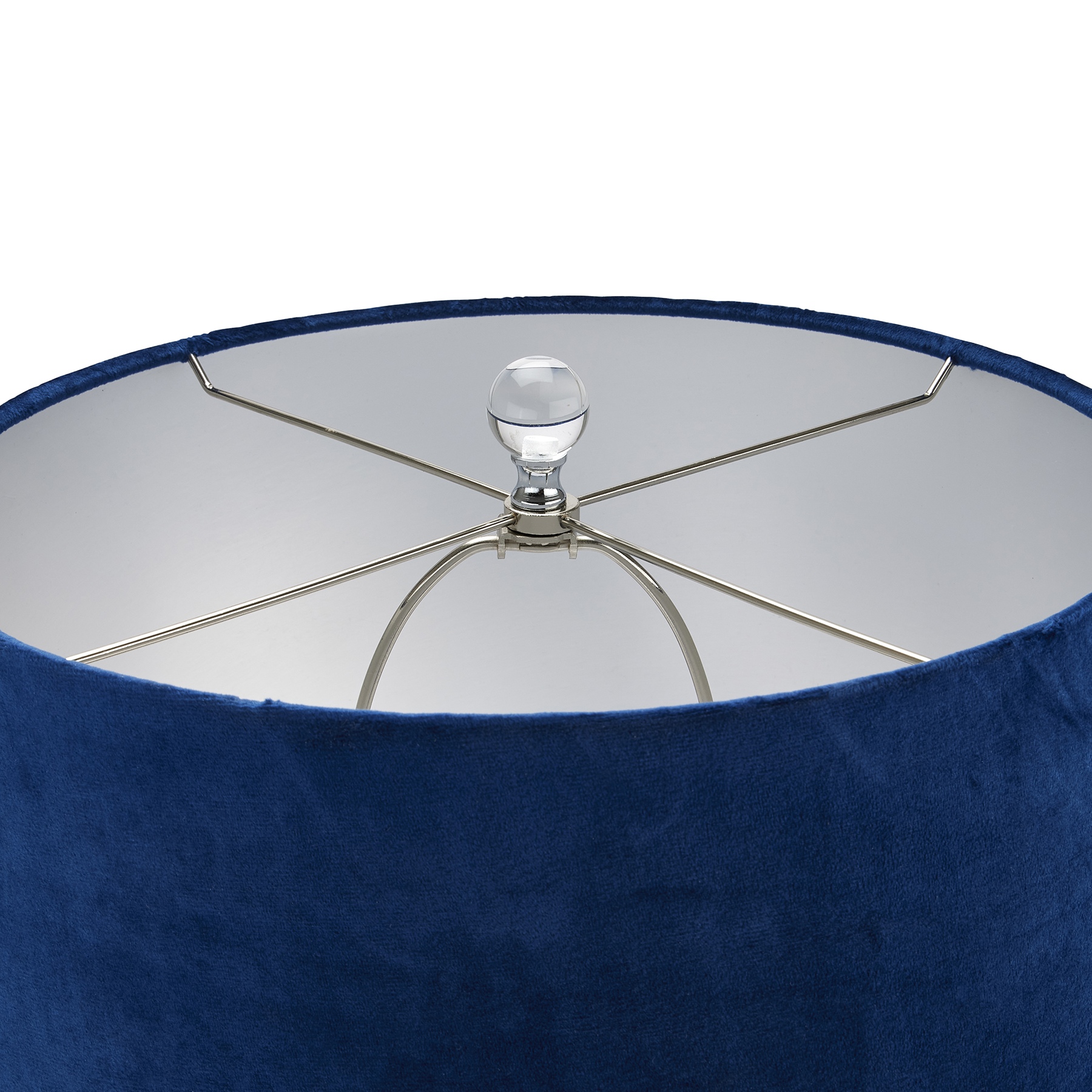 This is the Ice Shadows Table Lamp With Navy Blue Lampshade. This stylish Glass lamp with unique blue and white glaze comes complete with the premium quality ball-topped navy velvet shade, pictured. E