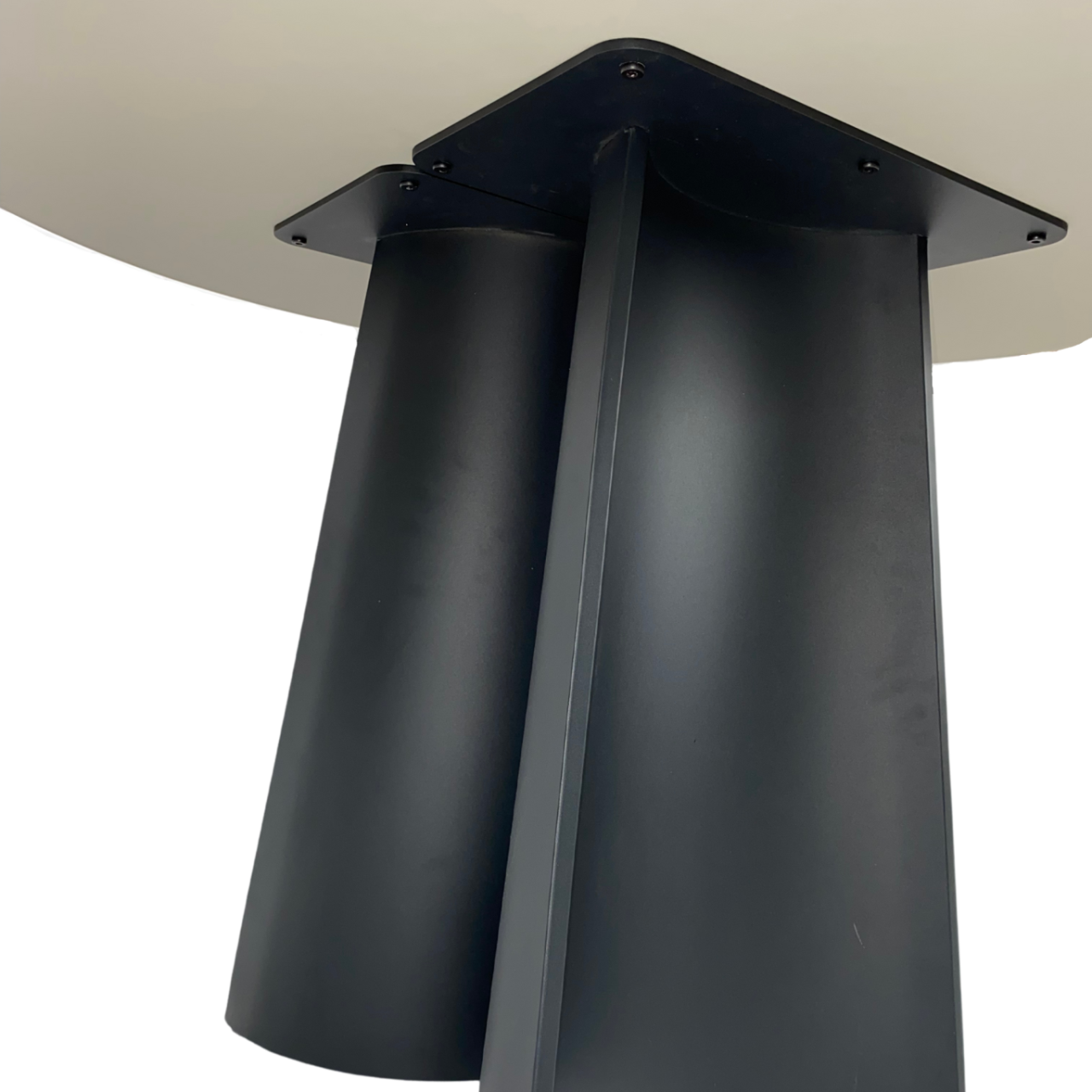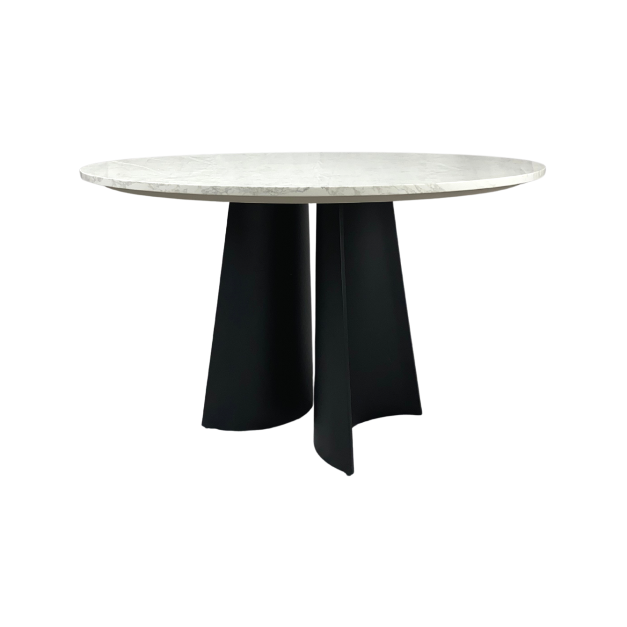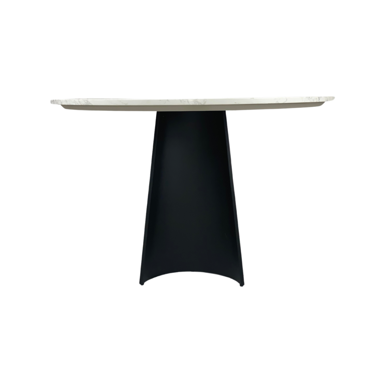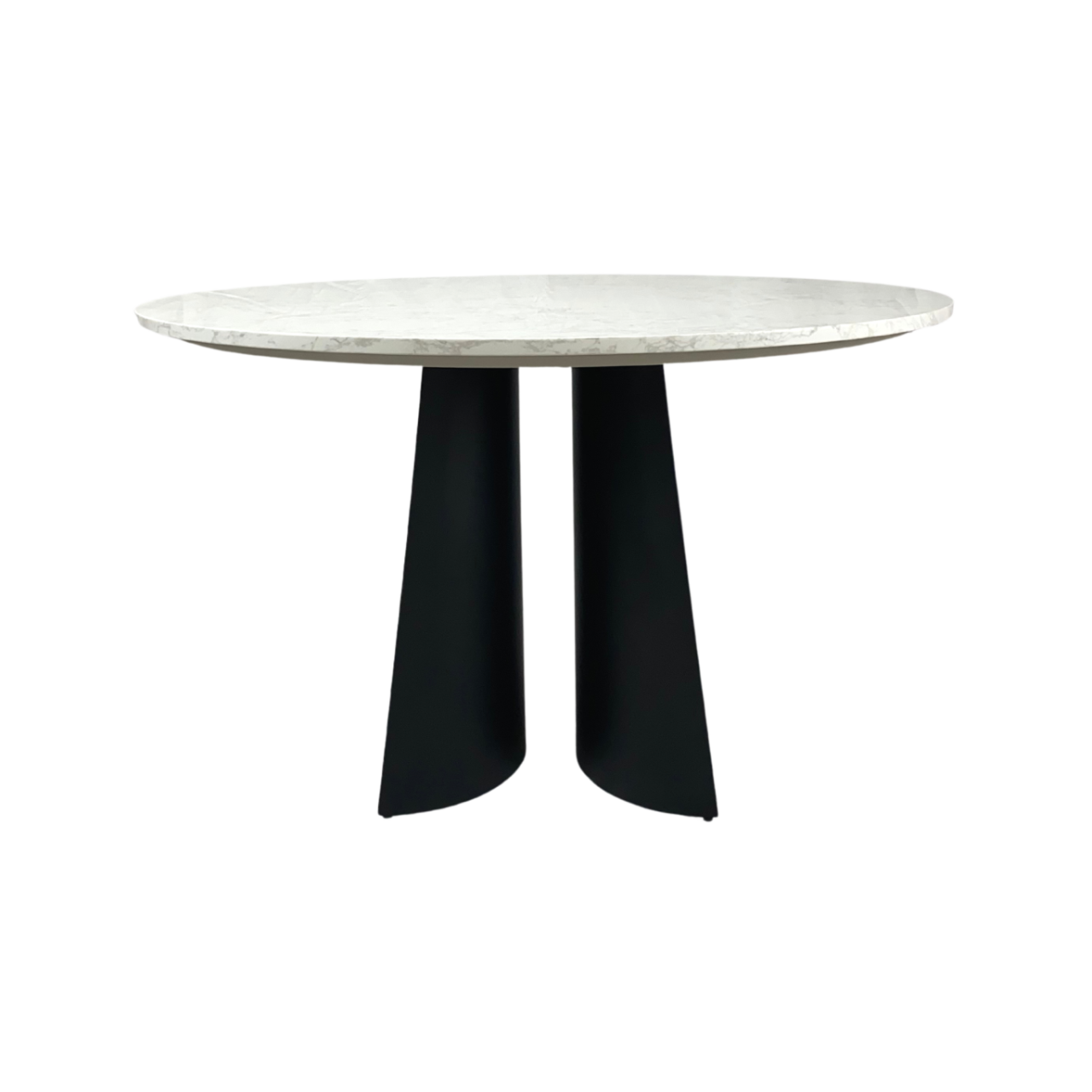 The Rosemary Round Dining Table is a stylish post-modern piece of furniture that would be the ideal fit for any modern, minimalist dining room. It’s spacious round top is made from artificial marble, which is ideal for kitchen settings because it is easy to clean and does not stain like regular marble. The top sits on an MDF board attached to two semi-conical legs of black, powder-coated metal. They are thick and hollow, to not weigh too much and have small protector pads at the bottom to protect the floor from scratching. Their dark colour contrasts with the white marble top, giving the Rosemary table an engaging, neutral look.
